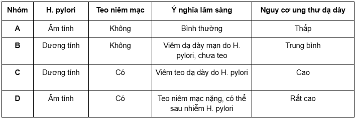 Dựa trên sự kết hợp giữa kháng thể H. pylori (+/-) và tình trạng teo niêm mạc (PG I ≤ 70 ng/mL và PG I/II ≤ 3,0), chia thành 4 nhóm: